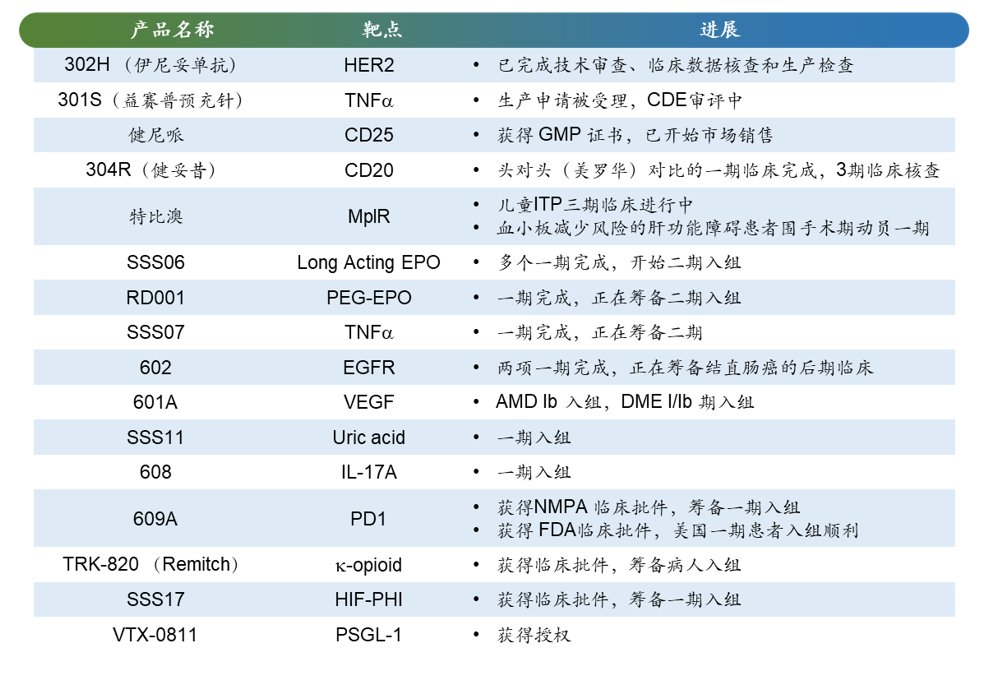 公司还在积极拓展现有产品的新适应症及二代产品,包括:第二代重组人促红素产品NuPIAO、聚乙二醇长效促红细胞生成素RD001、特比澳儿科ITP适应症等。